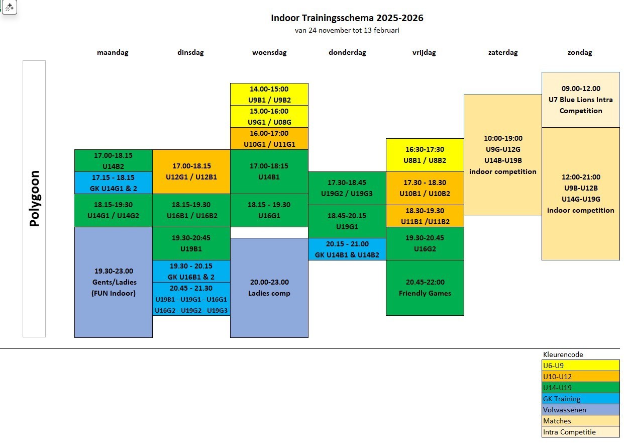 Het trainingsschema hangt af van de interesse van de leden, de beschikbaarheid van de zalen en de trainers. Voor iedere leeftijd proberen we de training op één van de trainingsdagen van het outdoorseizoen te laten plaatsvinden.