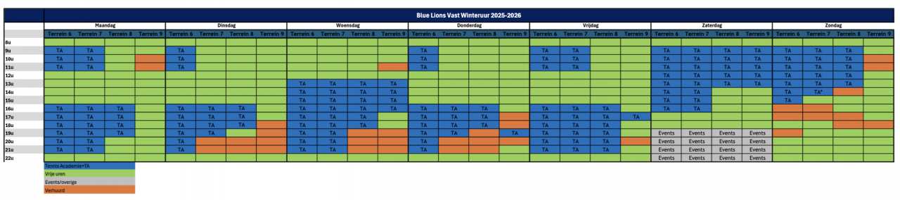 - Dubbeltornooi winter: 17 januari t/m 25 januari (week 4): 8-23u (weekend) + 17-23u (ma-vrij) (geen terreinen beschikbaar)