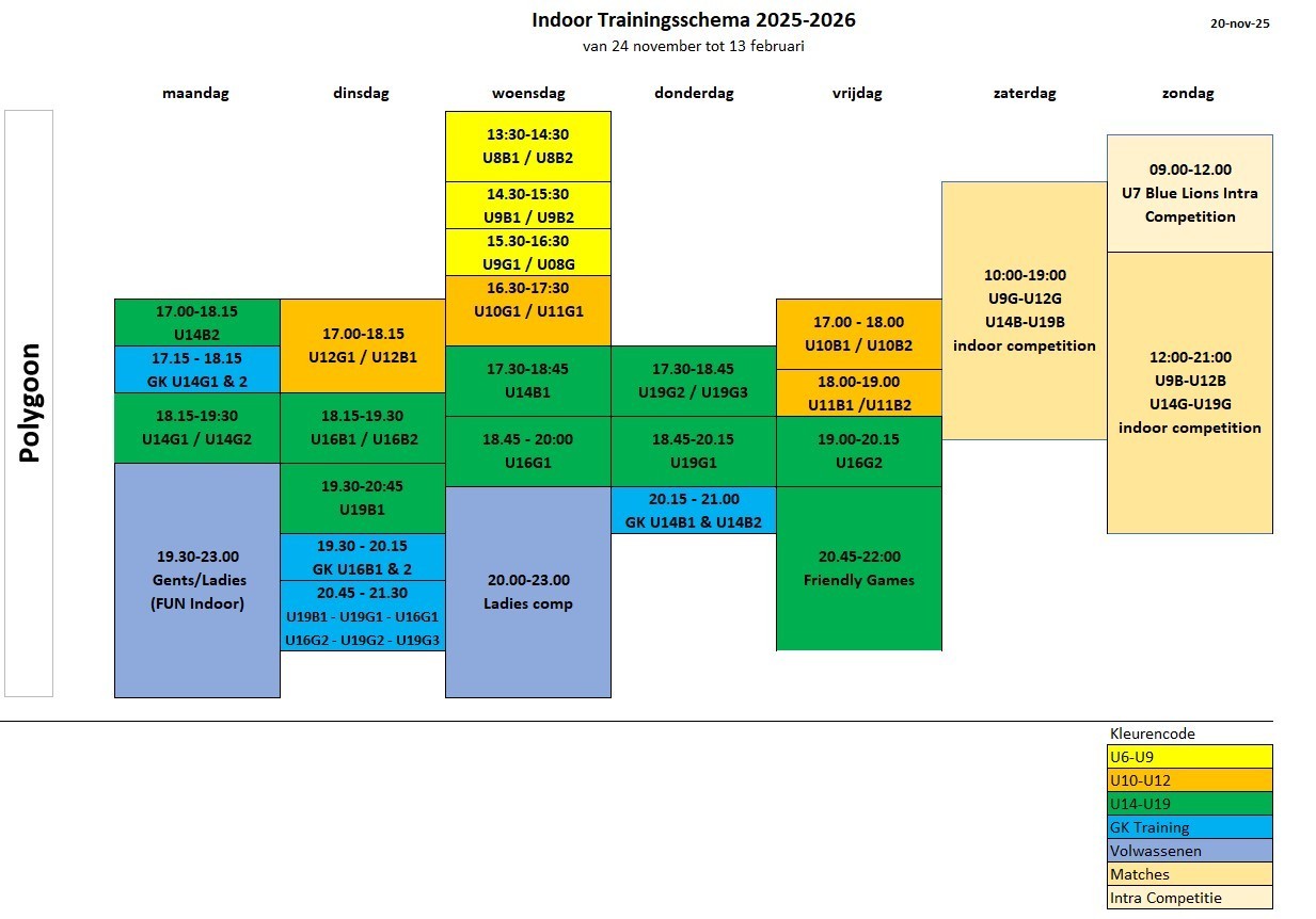 Het trainingsschema hangt af van de interesse van de leden, de beschikbaarheid van de zalen en de trainers. Voor iedere leeftijd proberen we de training op één van de trainingsdagen van het outdoorseizoen te laten plaatsvinden.